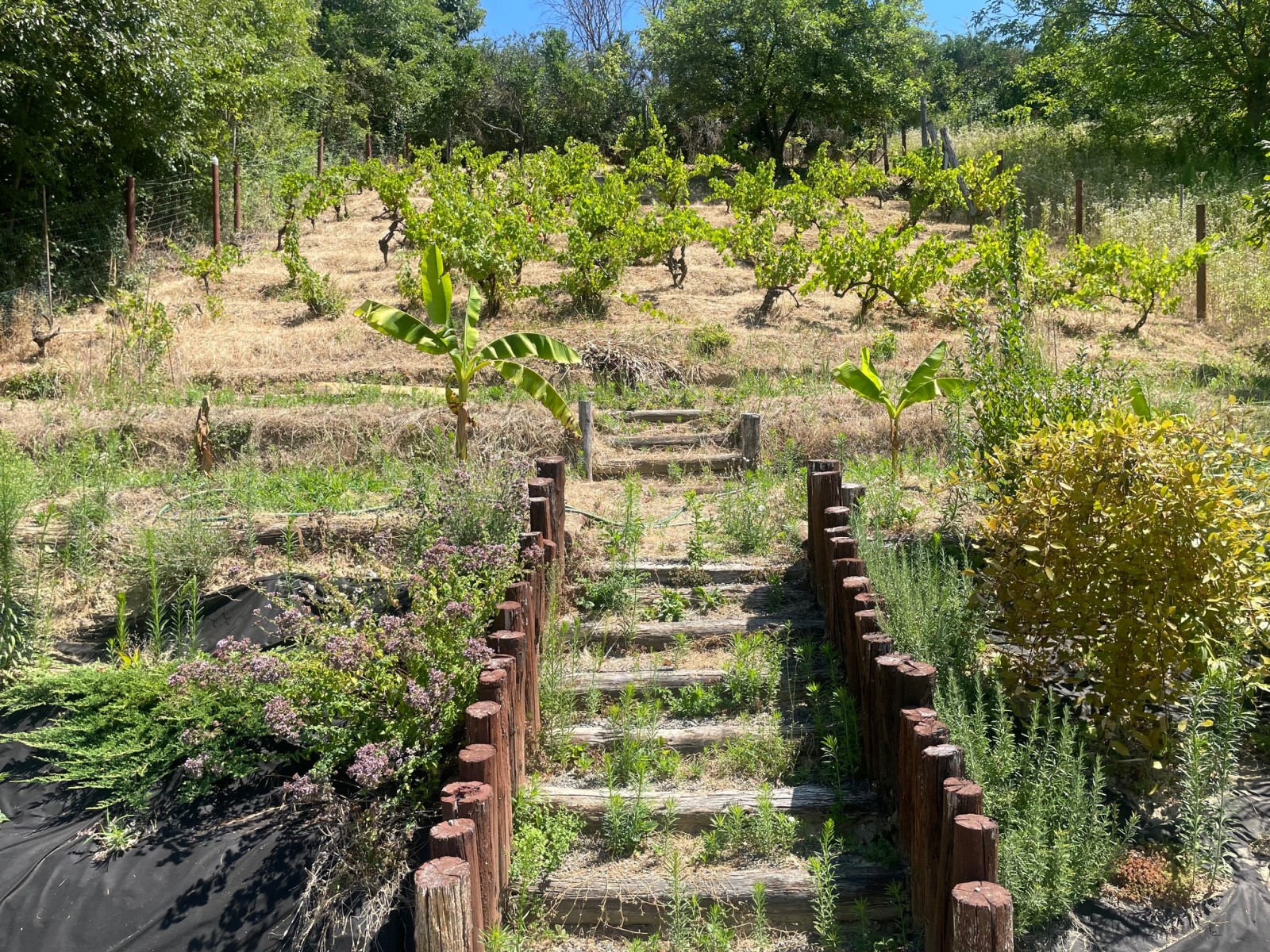 A telek eleje parkosított sík terület, hátul teraszos kialakítású, napozó terasszal, szőlőültetvénnyel.