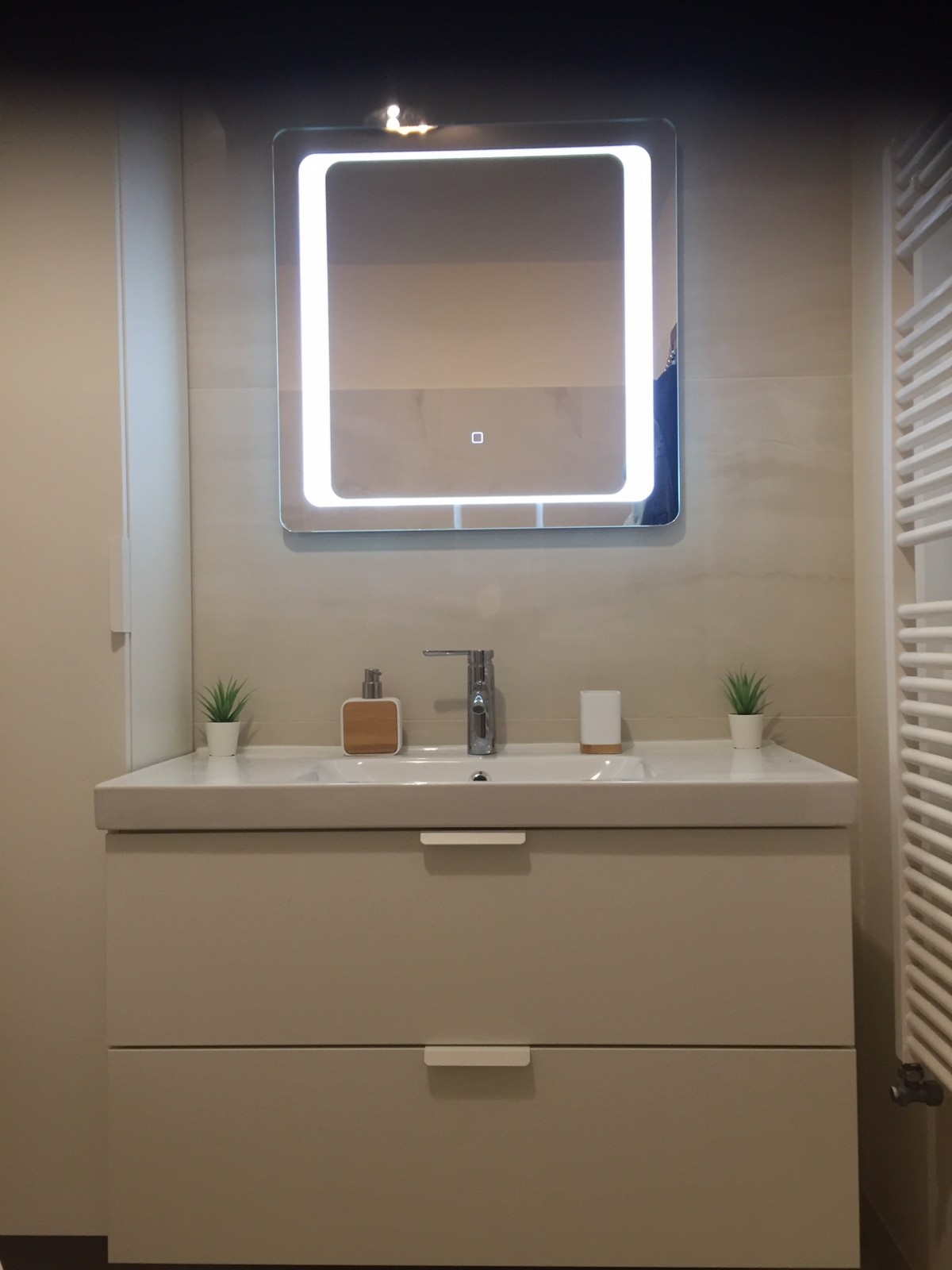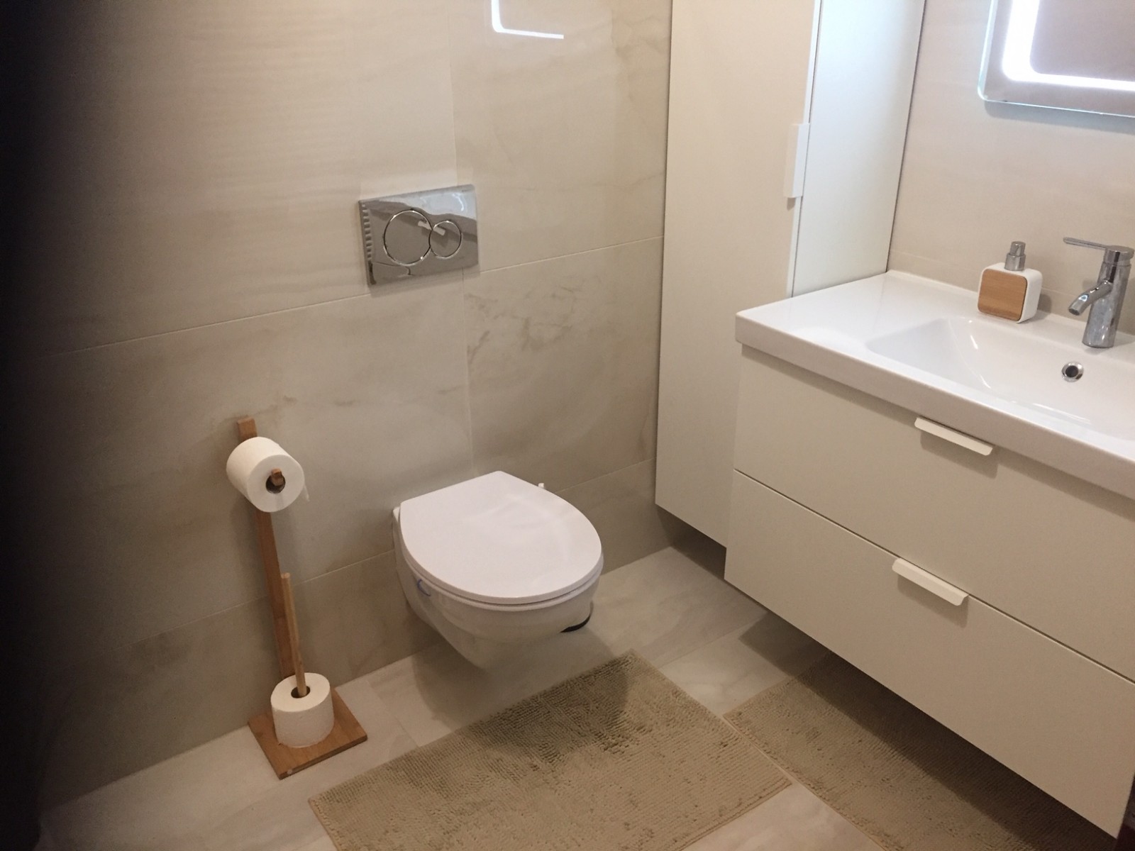 Fürdő: minőségi padló és falburkolat (MIRAGE Jewels JW Onyks 60x120), MÉTA M-acryl Sortiment egyenes kád, HANSGROHE le-és túlfolyó króm garnitúra, GEBERIT fali WC lecsapódás mentes wc tetővel, GROHE csaptelepek, HELIOS 100-as szellőző berendezés, érintőgombos falitükör led világítással, energia takarékos mennyezeti világítás.